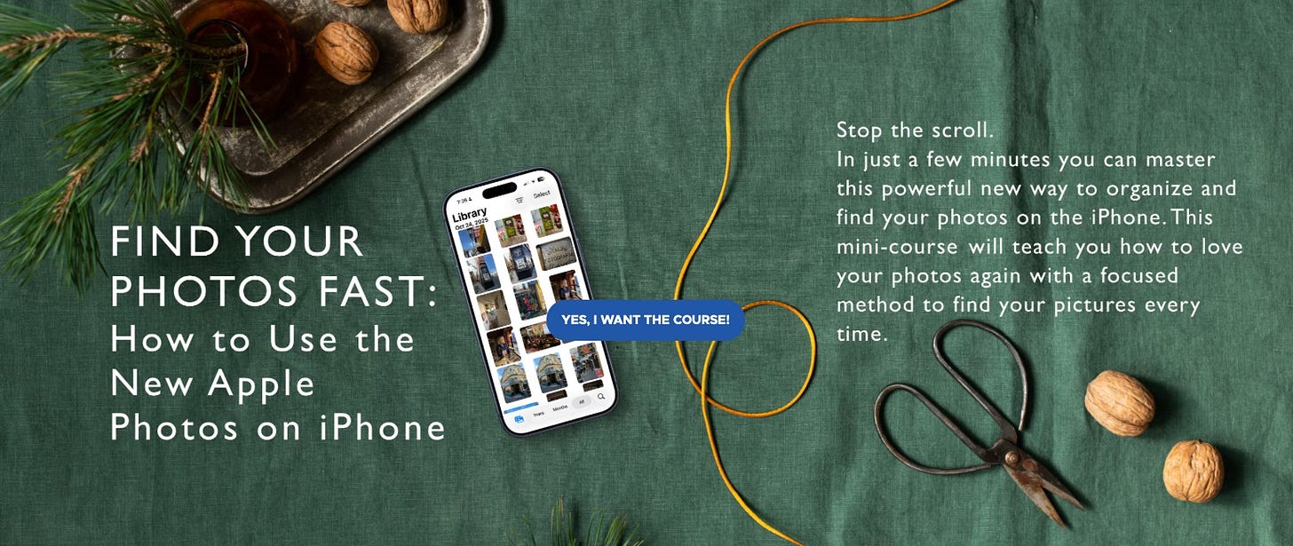 And while we’re in the mastery mindset, another great deal is my mini-course that explains how to navigate the new iPhone layout in Apple Photos whether you have iOS 18 (last year) or upgraded to iOS 26 (this year). This $39 mini-course is priced at $32 as a holiday special, also through Friday, December 19th. The course takes you through 10 short lessons that show you how to stop endlessly scrolling when you want to find a photo. Find the pictures you want in seconds. It’s almost magic. Amaze your friends and love your photos again.